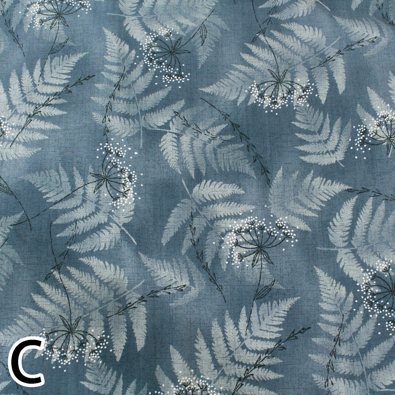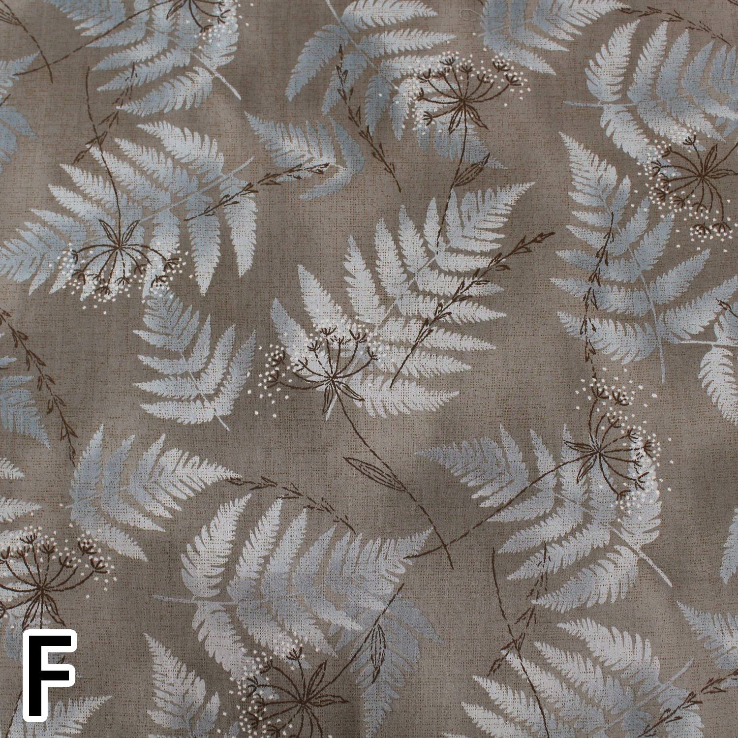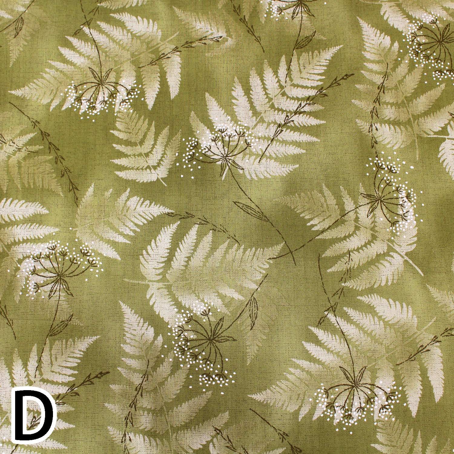 Cotton print fabric with large fern leaves on a soft and blurred background.