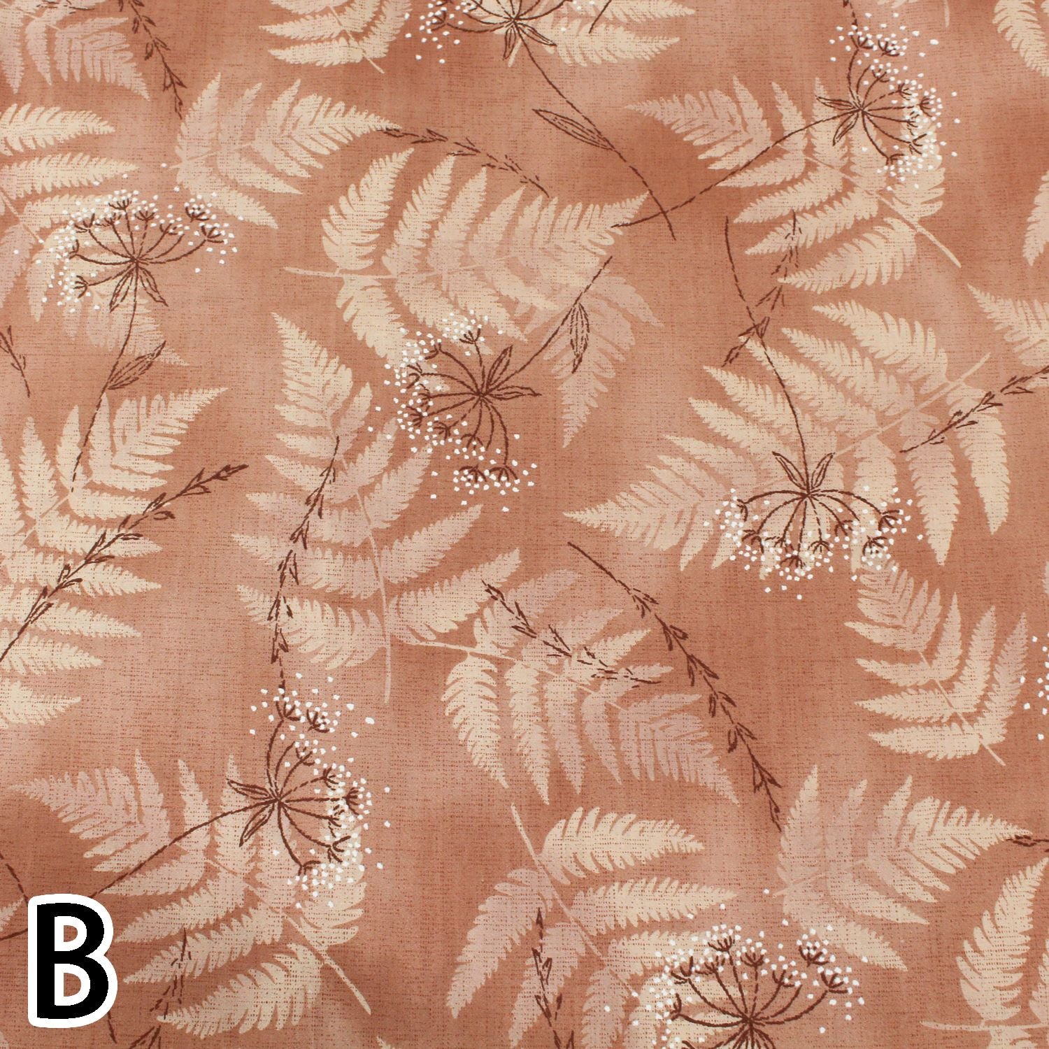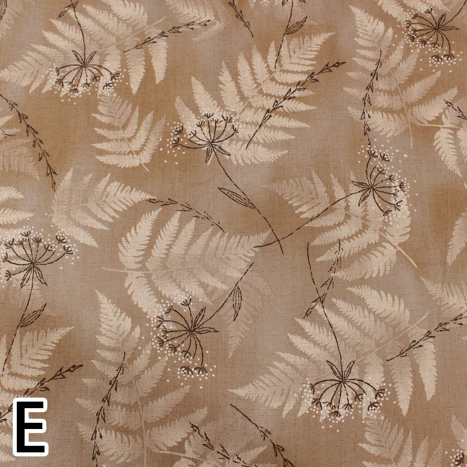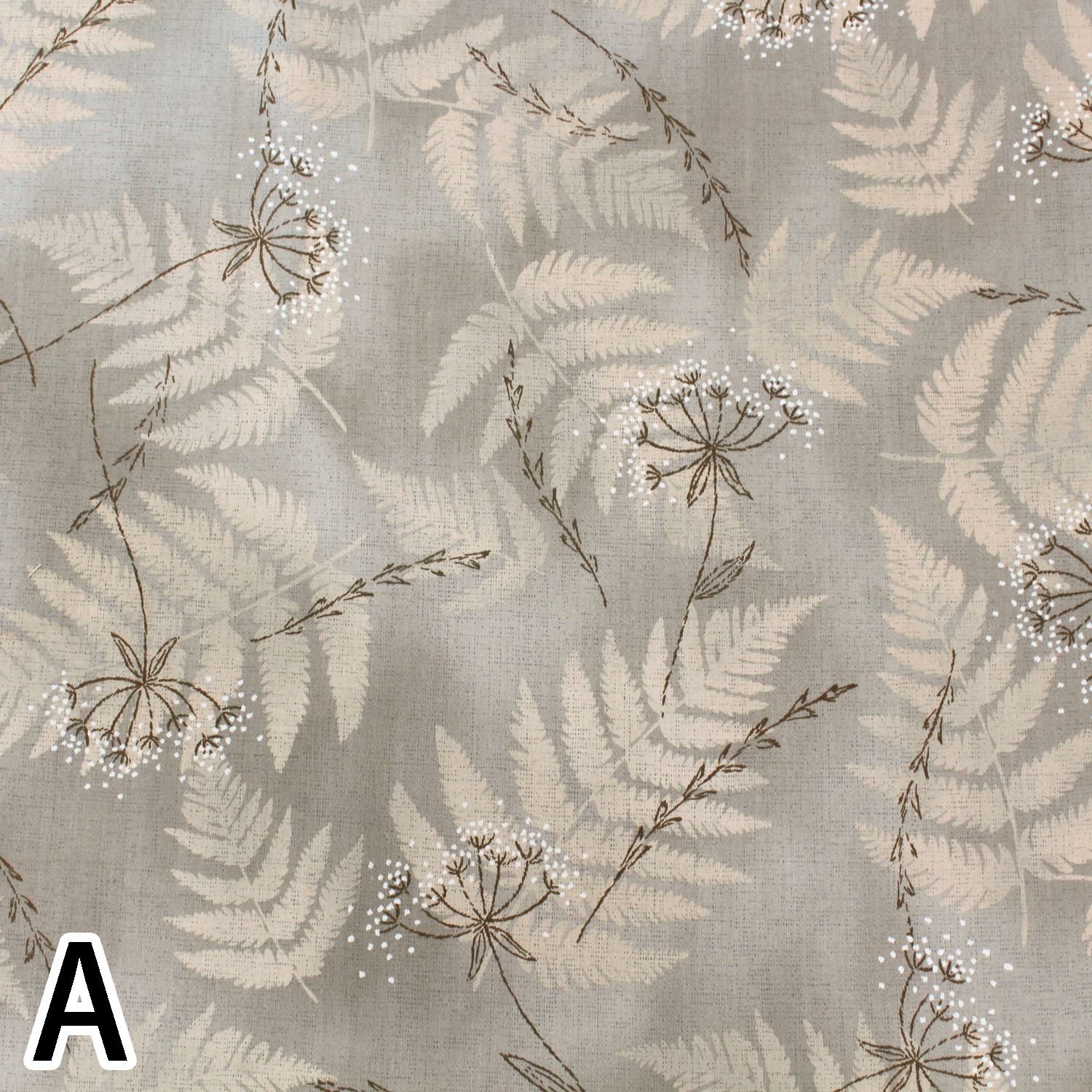 Cotton print fabric with large fern leaves on a soft and blurred background.